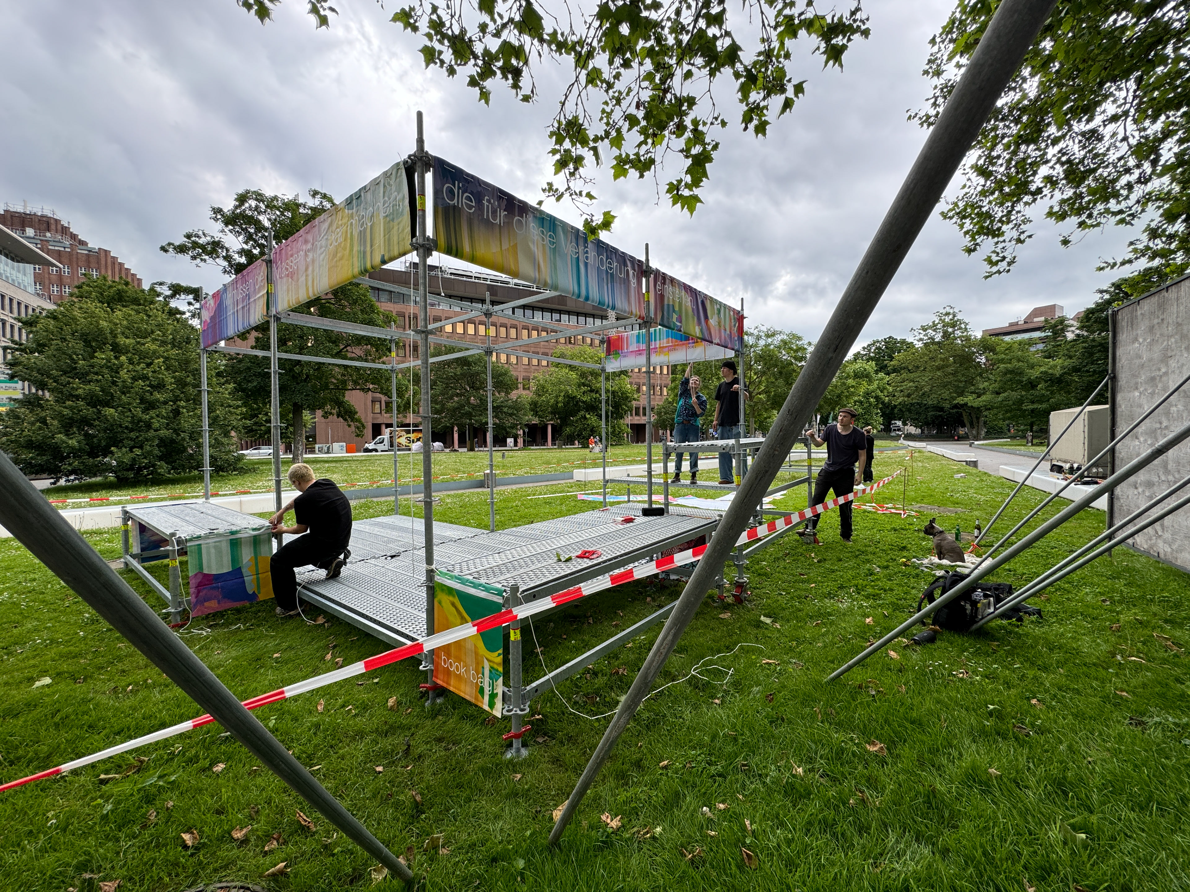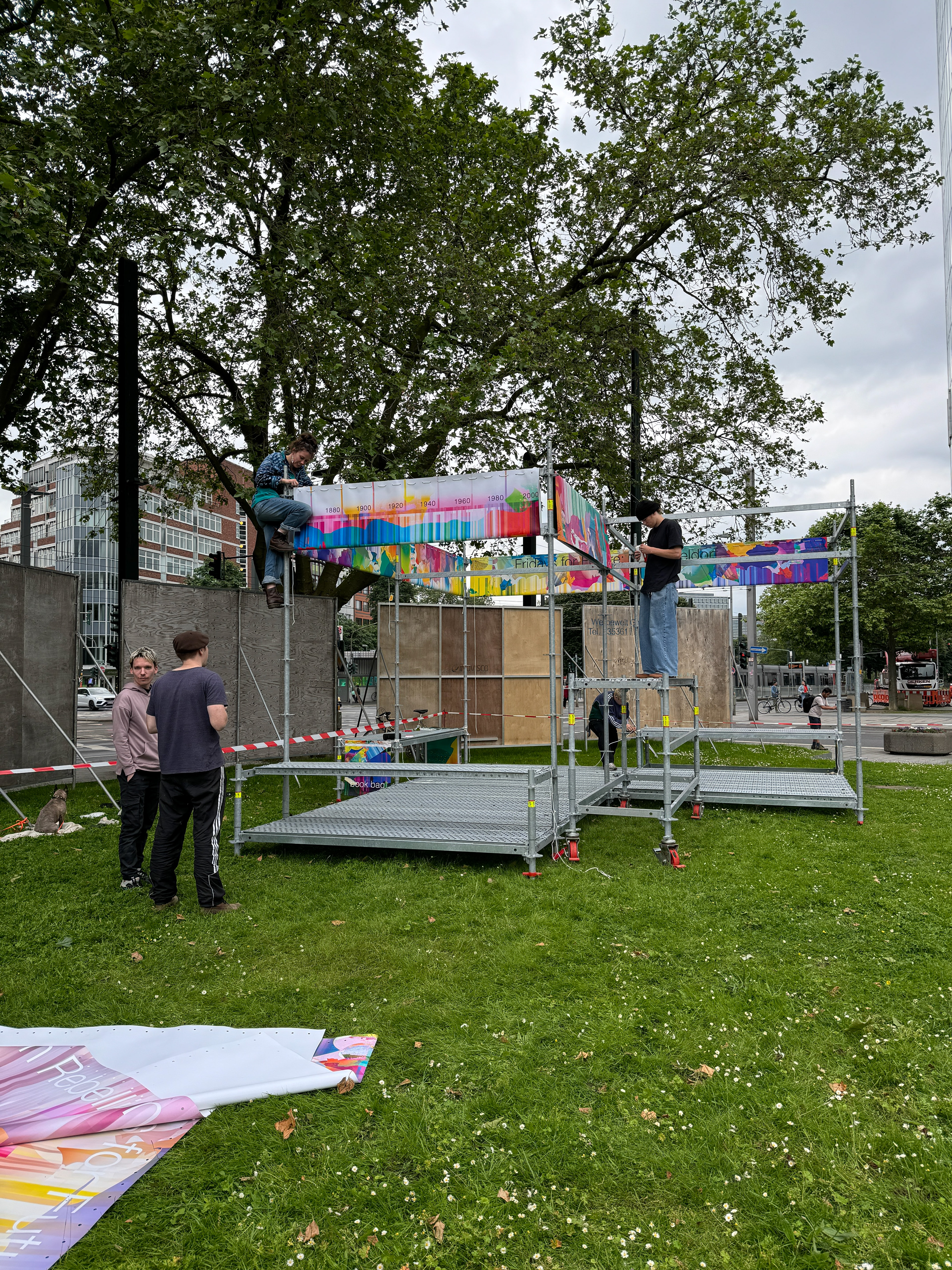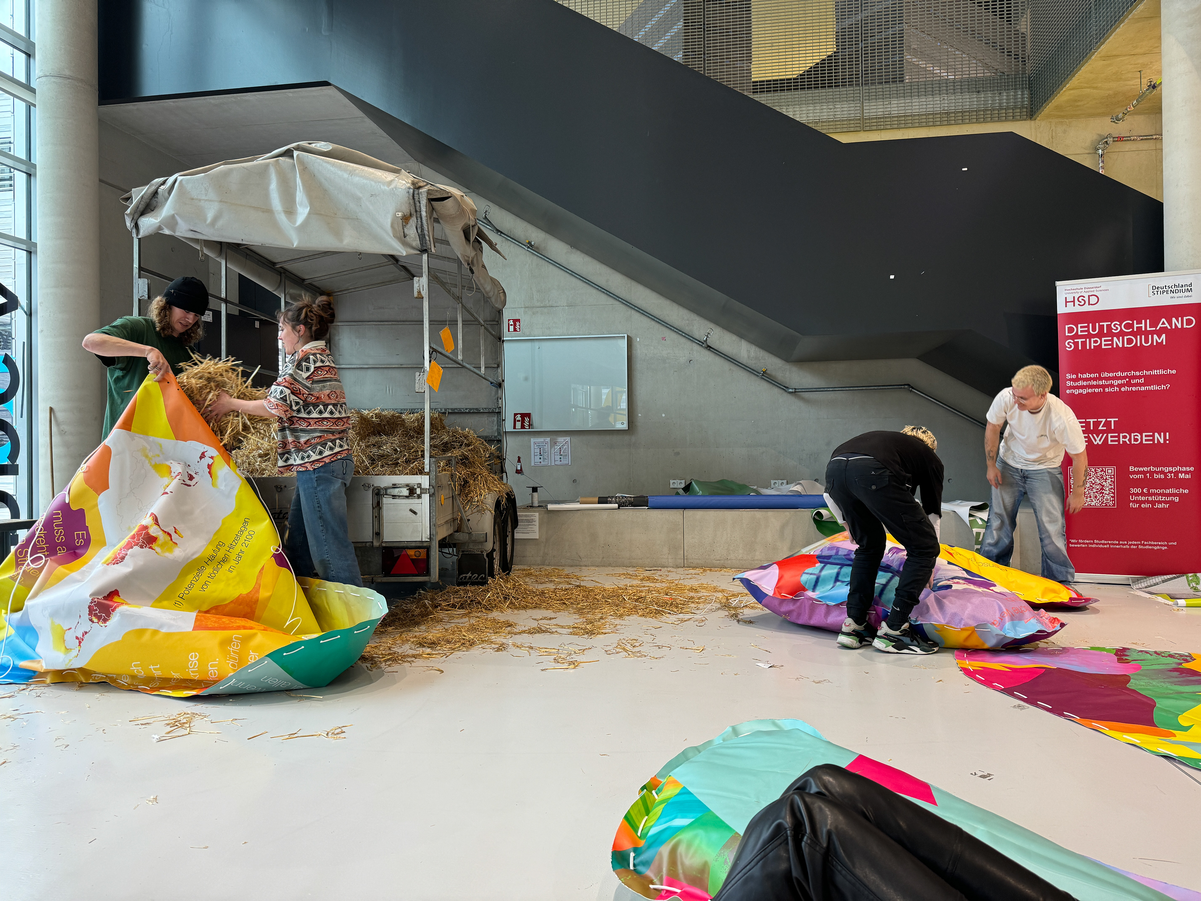 Für die Ausstellung „Eine Straße“ von Markus Ambach Projekte vom 8. Juni bis 18. August 2024 haben wir im Rahmen eines Blockseminars für Fridays for Future einen multifunktionalen Raum am Graf-Adolf-Platz in Düsseldorf geschaffen. Das Projekt umfasste eine Struktur, die als Bühne, Sitzbereich oder Plakattisch dienen kann, mit bedruckten Sitzsäcken aus recycelten Planen und gefüllt mit Stroh. Der Raum war mit Bannern geschmückt, auf denen Grafiken aus den Fotos und Statistiken von Fridays for Future abgebildet waren. Dieser Chill-out-Bereich wurde knapp drei Monate lang für wöchentliche Treffen, Vorträge und Veranstaltungen von Fridays for Future genutzt.