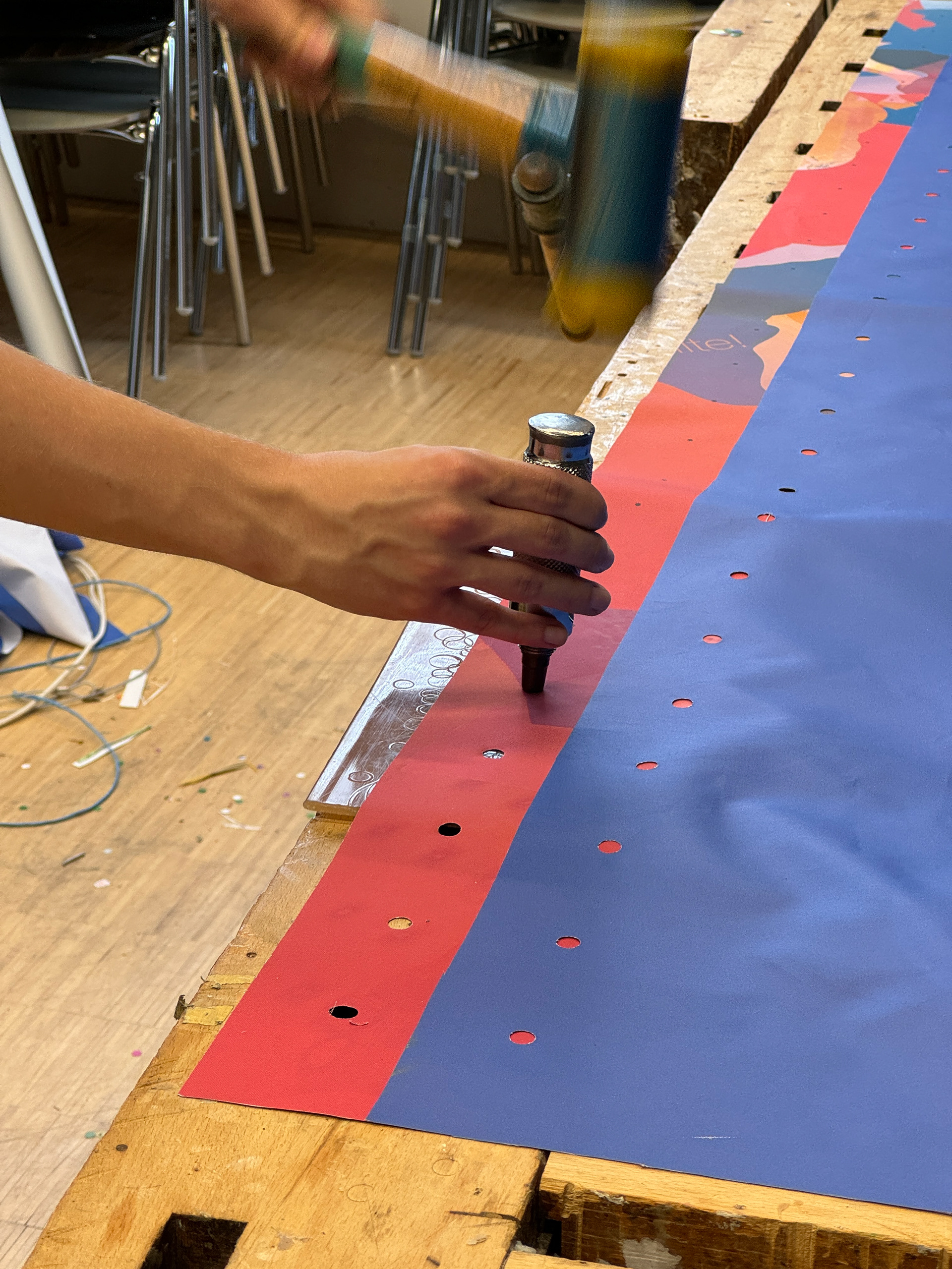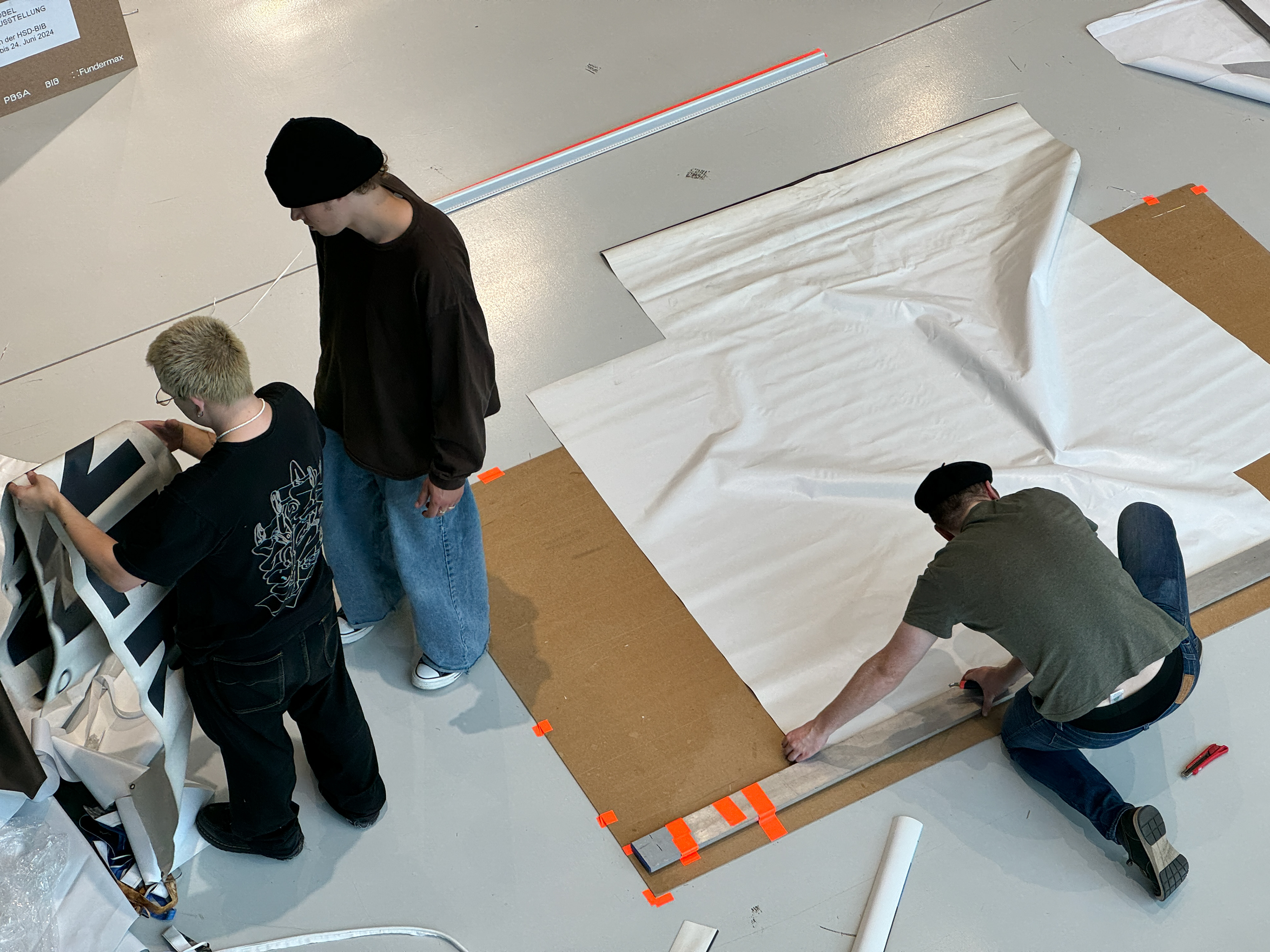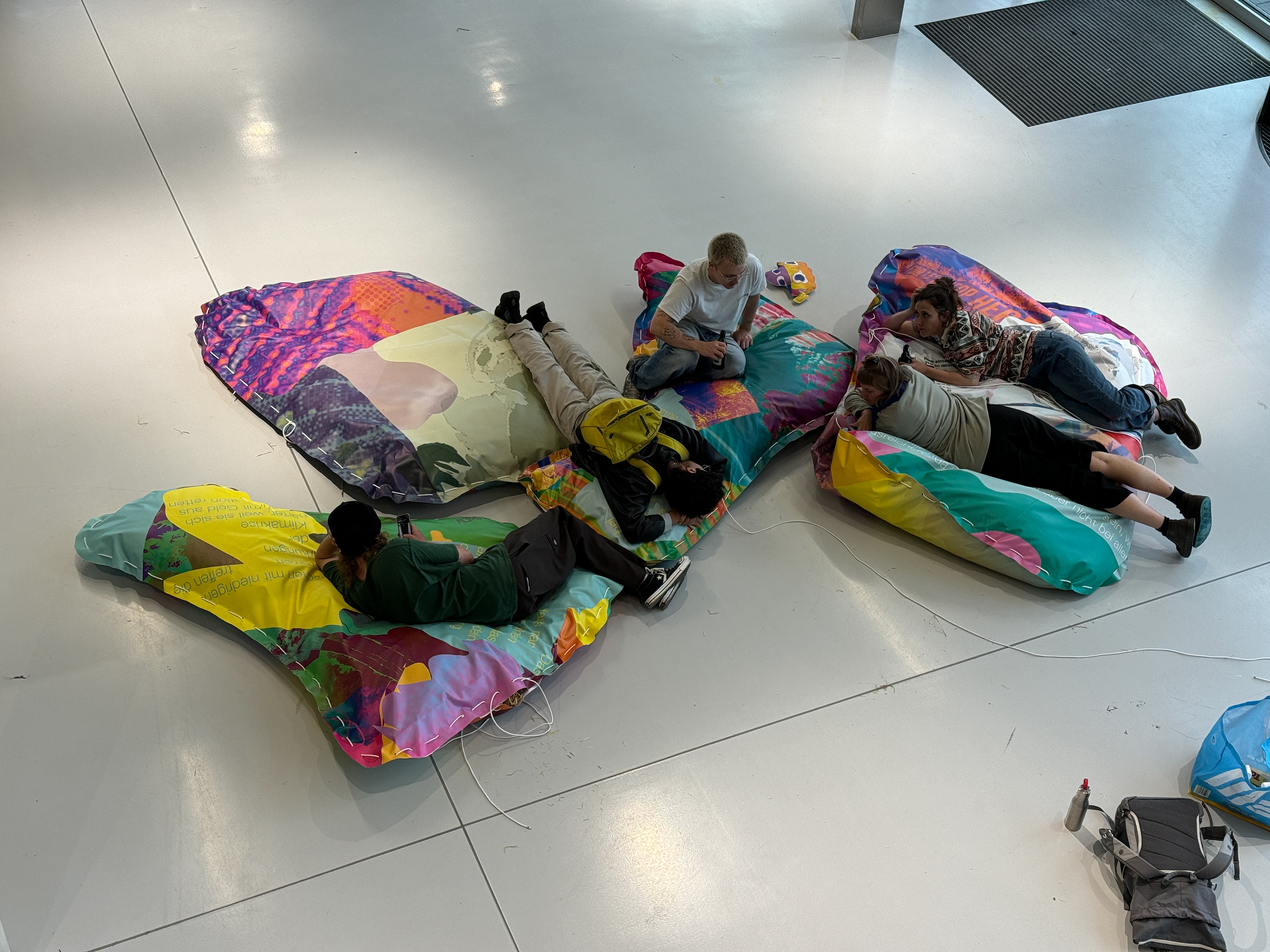 Für die Ausstellung „Eine Straße“ von Markus Ambach Projekte vom 8. Juni bis 18. August 2024 haben wir im Rahmen eines Blockseminars für Fridays for Future einen multifunktionalen Raum am Graf-Adolf-Platz in Düsseldorf geschaffen. Das Projekt umfasste eine Struktur, die als Bühne, Sitzbereich oder Plakattisch dienen kann, mit bedruckten Sitzsäcken aus recycelten Planen und gefüllt mit Stroh. Der Raum war mit Bannern geschmückt, auf denen Grafiken aus den Fotos und Statistiken von Fridays for Future abgebildet waren. Dieser Chill-out-Bereich wurde knapp drei Monate lang für wöchentliche Treffen, Vorträge und Veranstaltungen von Fridays for Future genutzt.